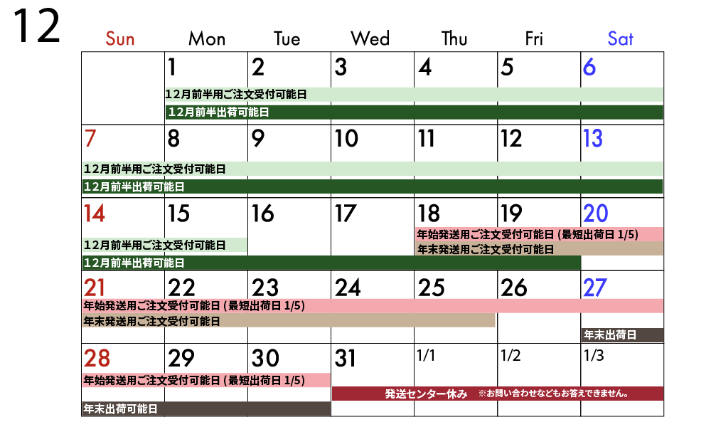 該当商品における年内発送の最終ご注文受付日は以下の通りになります。