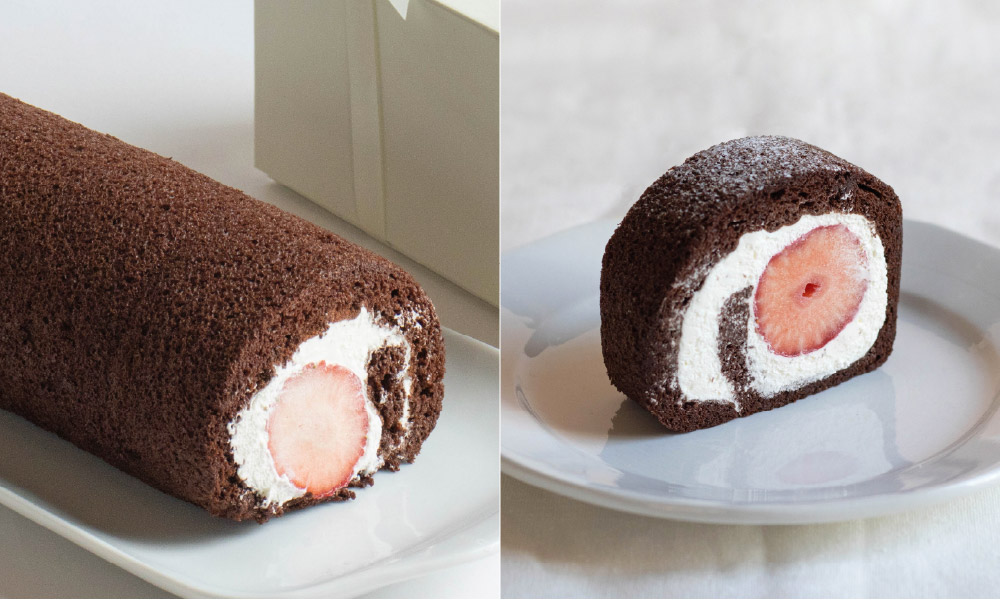 小麦粉を使用せずココアのみで焼き上げたビターな生地が特徴のいちごロール。