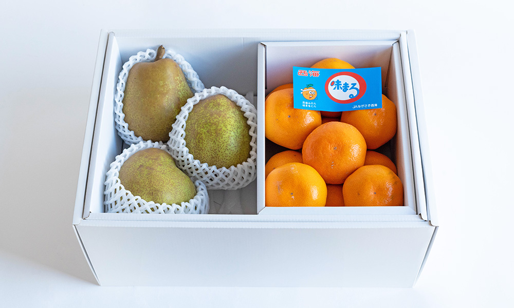 山形県上山のいたがきの契約農家であるラ・フランス作りの名人が育てた滑らかな舌触りが特徴のラ・フランス3玉と、長崎県西海地区の甘みと酸味のバランスが良いみかん「味まる」を1箱にまとめたフルーツセットです。