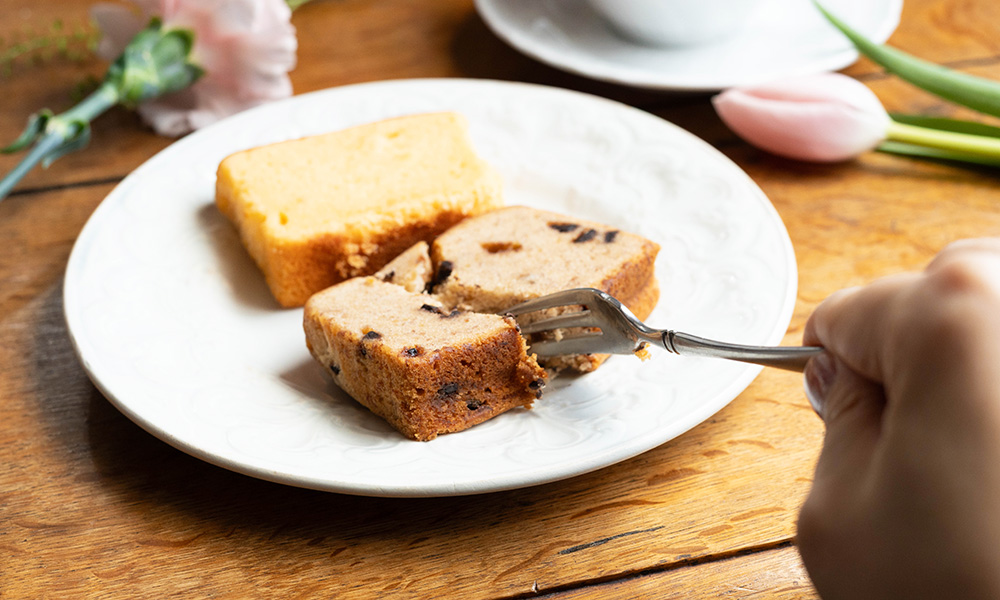 しっとりとした食べ応えのあるパウンドケーキとと苺の香りがする紅茶で