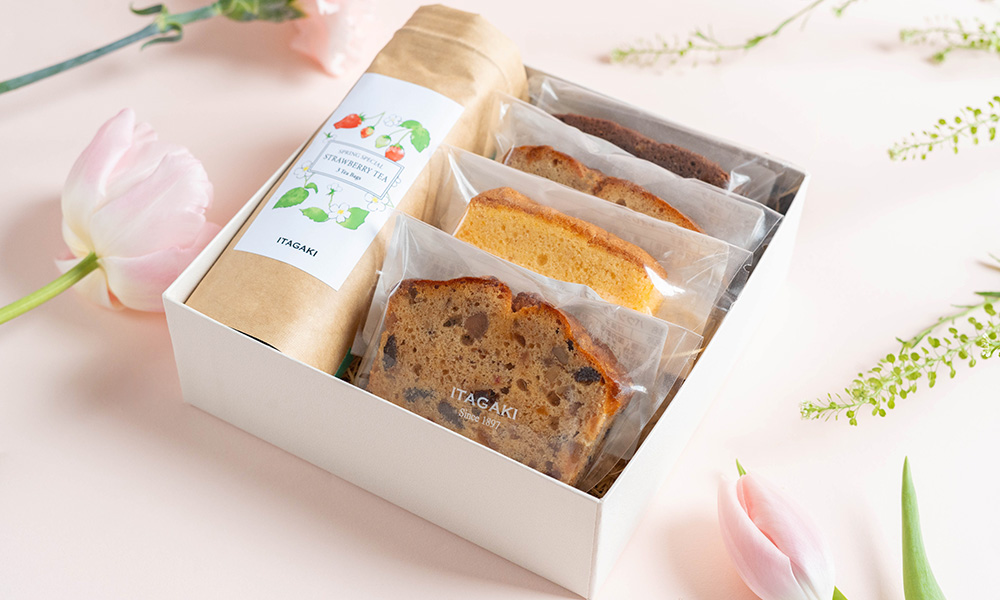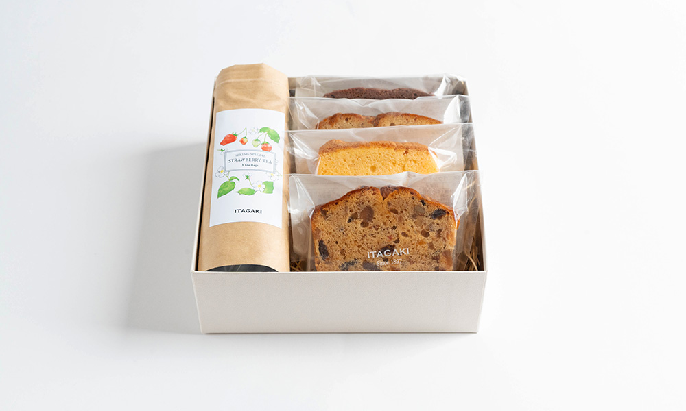 いたがき定番のサパウンドケーキ4種をセットにし、春らしいラッピングでお届けします。